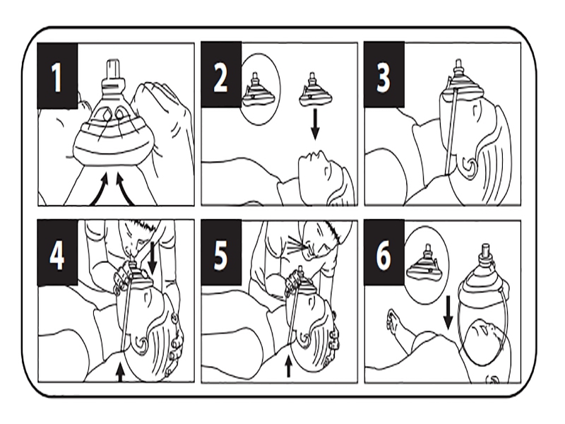 4. أغلق كما هو موضح وانفخ ببطء في الصمام أحادي الاتجاه حتى يرتفع الصدر.